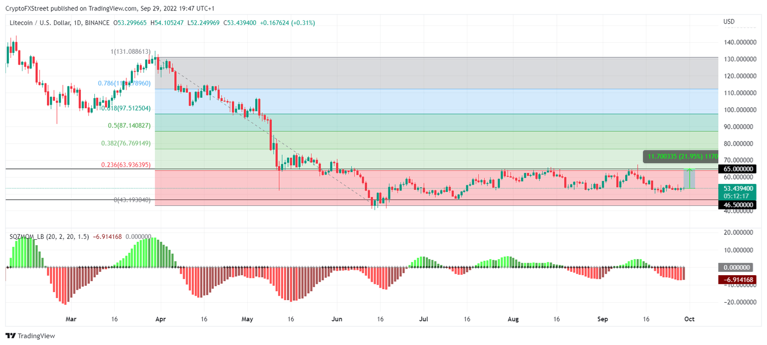 Litecoin has been stuck between the same support and resistance levels for three months, oscillating between $65 and $46.5. According to price indicators, Litecoin is witnessing a bullish squeeze release, which could propel it towards the 23.6% Fibonacci level. The lack of recovery has led to over 78% of all Litecoin investors witnessing losses on their holdings.