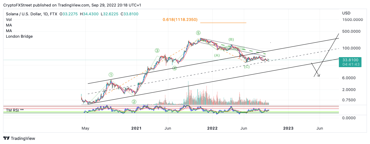 Solana price has retracted into a previous fourth wave after printing three sets of impulse waves up. SOL price hovers over a parallel channel median line with a tapered volume pattern on the Volume Profile Index. SOL price has 90% cushion space to fall without invalidating the macro count.