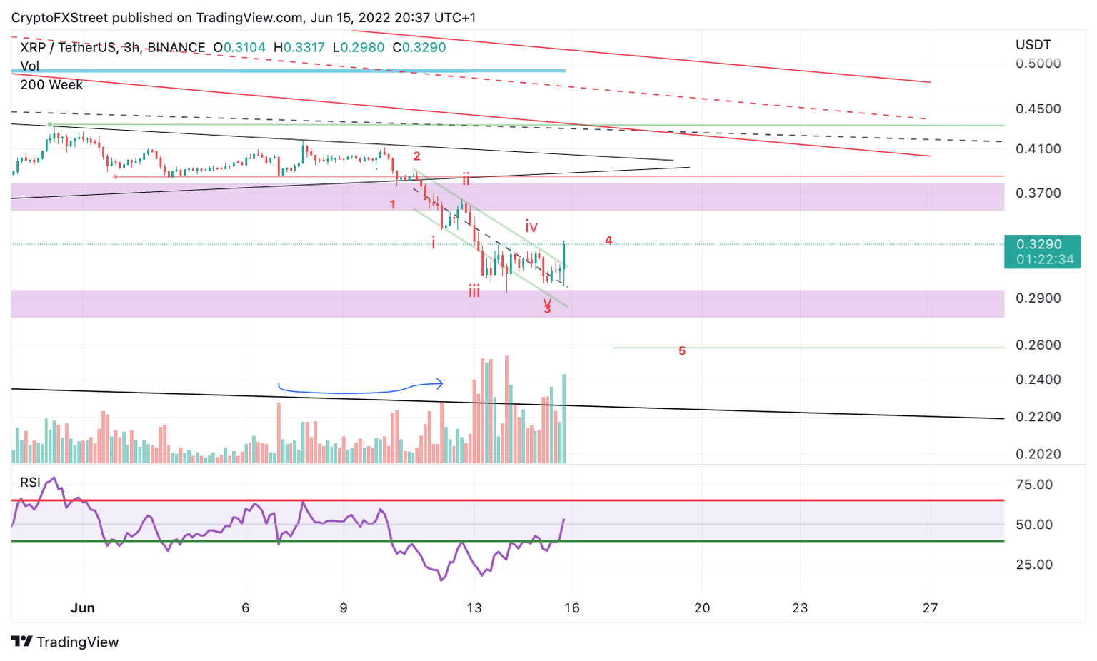 Ripple price trades in territory unseen since January of 2021. On Wednesday, the bulls are treading on thin ice as they have established a primitive level of support in the $0.31 zone. Currently, the bullish retaliation is not enough to justify a countertrend scalp. Analyzing the decline from last week's trade setup, the bears have printed an anticipated impulse wave down. However, the technicals suggest the downfall may not be over as the retracements within each decline do not bestow enough bullish signals to label the downtrend over.