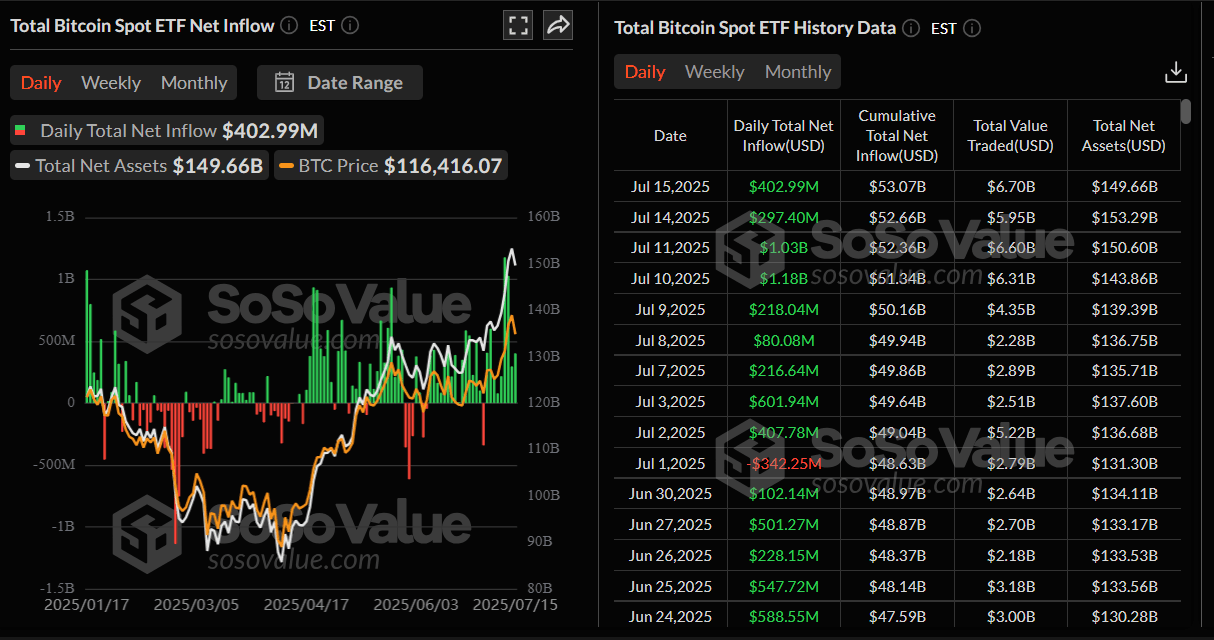 Bitcoin (BTC) price recovers slightly, trading near $119,000 at the time of writing on Wednesday after falling nearly 2% the previous day. This recovery comes following the announcement by the US President Donald Trump early on Wednesday that the GENIUS Act is ready to pass through the House of Representatives during the legislative “Crypto Week”, fueling optimism in the crypto markets. Moreover, institutional demand continues to strengthen, as the spot Bitcoin Exchange Traded Funds (ETFs) recorded over $400 million in inflows on Tuesday, continuing the streak of inflows since July 2.