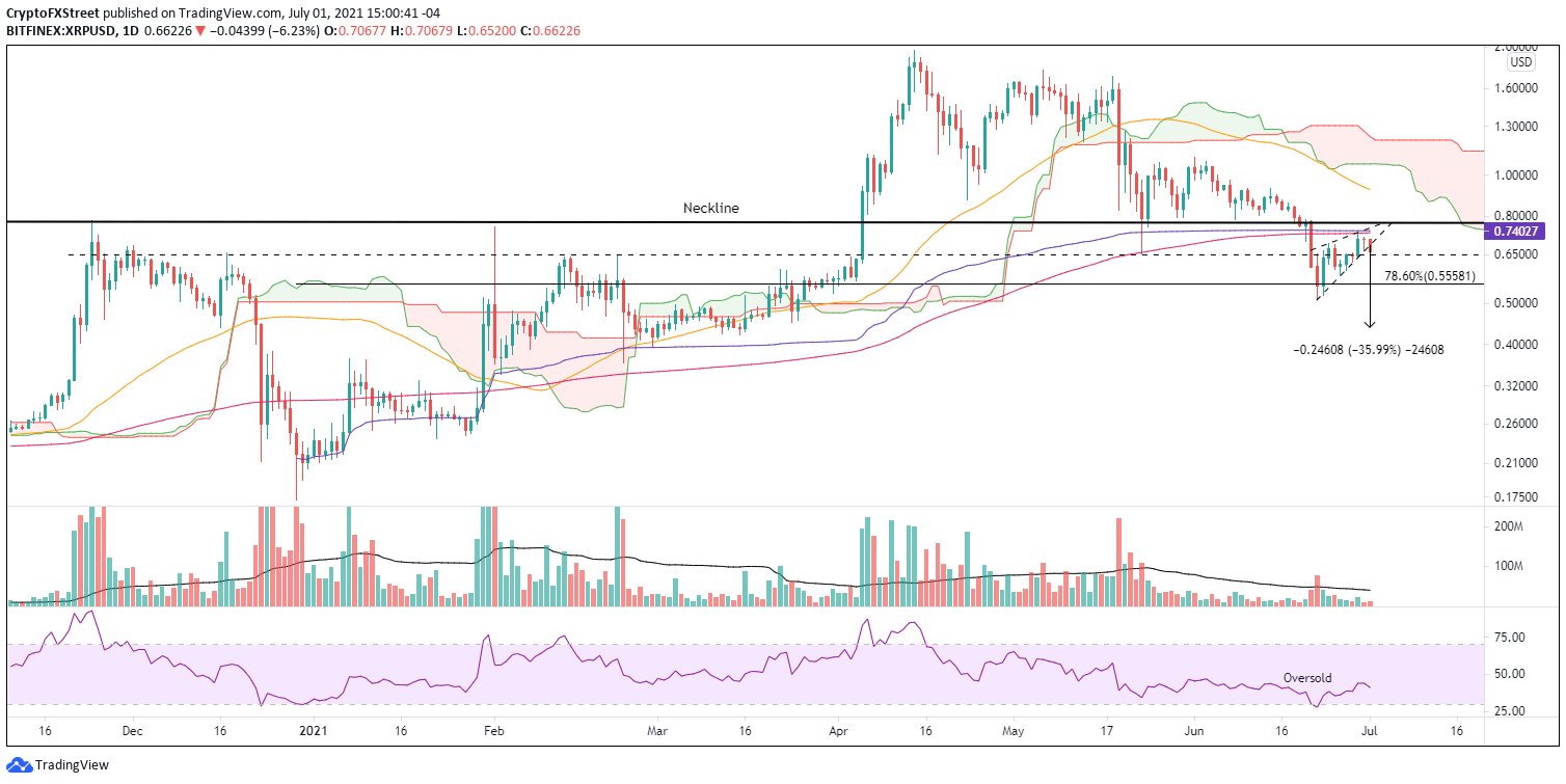 XRP price did engineer a 45% gain from the June 22 low to the June 29 high, but it does not meet the criteria of an impulsive recovery as volume was unimpressive. Today’s breakdown from a bearish flag pattern reflects the corrective temperament of the rebound. It has raised the odds that Ripple will break below $0.650 and target the 78.6% Fibonacci retracement level of $0.555 and potentially the June 22 low of $0.512.