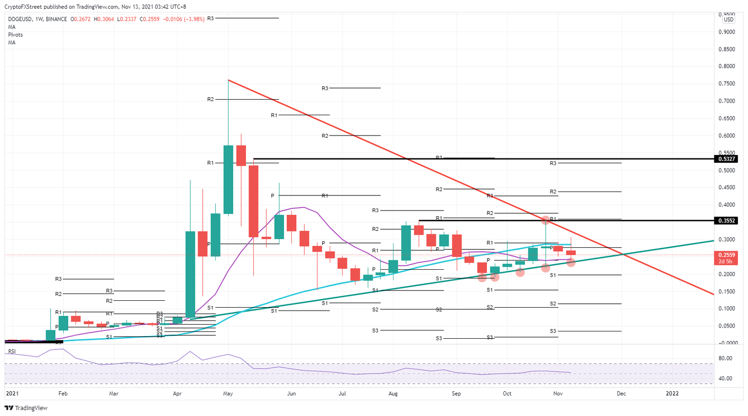 Dogecoin (DOGE) price has been in an uptrend since April but has seen some whipsaw price action along the way. Nonetheless, the lower end of the DOGE price reaction has been supported continuously by bulls around the green ascending trend line. As the price squeeze sees lower highs and higher lows, expect a bullish breakout towards $0.53.