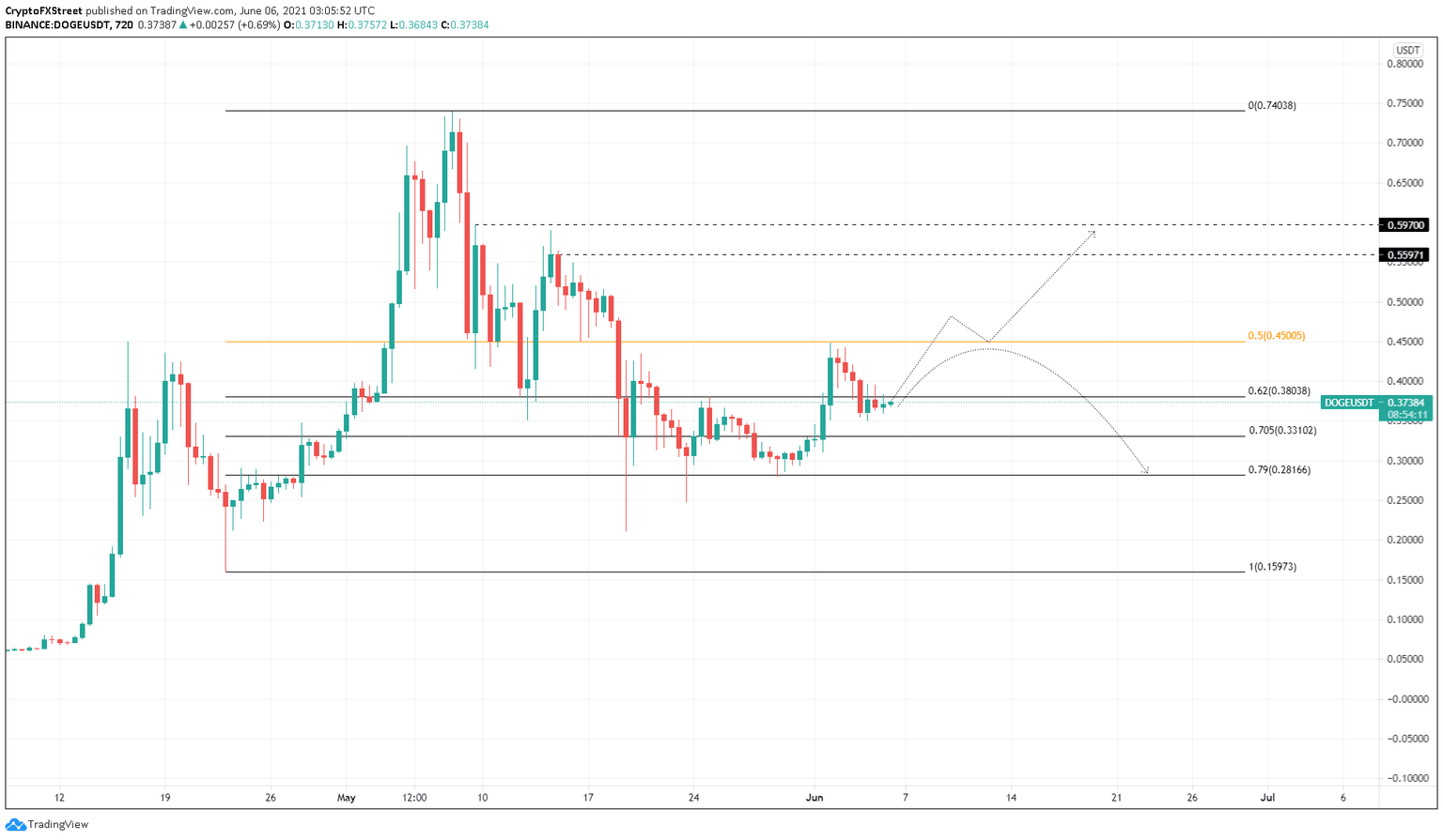 Dogecoin price is currently in a no-trading zone per se and shows no apparent bias. The 71% drawdown has reduced to 50% after the recent recovery. However, a confirmed bullish prejudice has not developed yet. After a rally above $0.45, if DOGE breaks down $0.380, the bullish thesis will face invalidation.