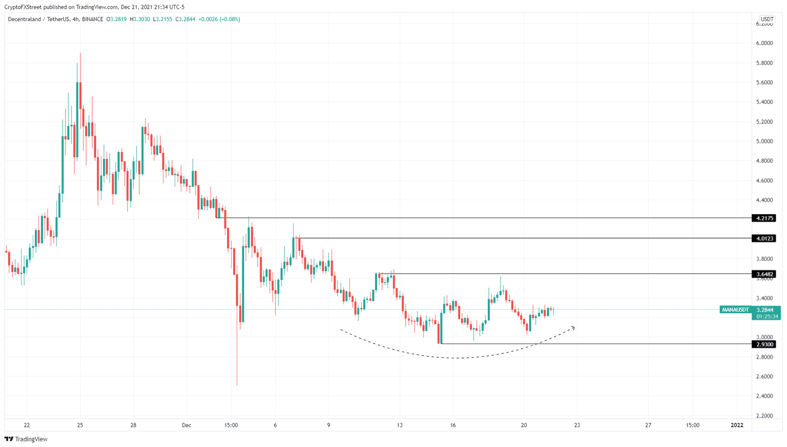 Decentraland price has produced three lower lows and four lower highs since December 6, indicating a steady downtrend. However, after the December 15 swing low at $2.93, the tide is turning for MANA, starting with higher lows, indicating a slow shift in favor toward bulls. Although there have been two higher highs, Decentraland price needs to produce a four-hour candlestick above $3.64, to solidify its stance.