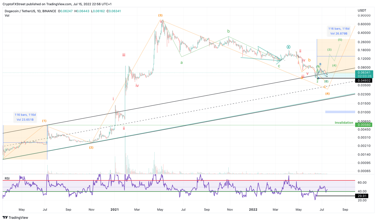 Dogecoin hovers over an ascending parallel channel. DOGE price has retreated into the $0.05 barrier but has 20% more wiggle room to fall without invalidating mid-term bullish projections. Safe invalidation of the downtrend is a breach above $0.07634