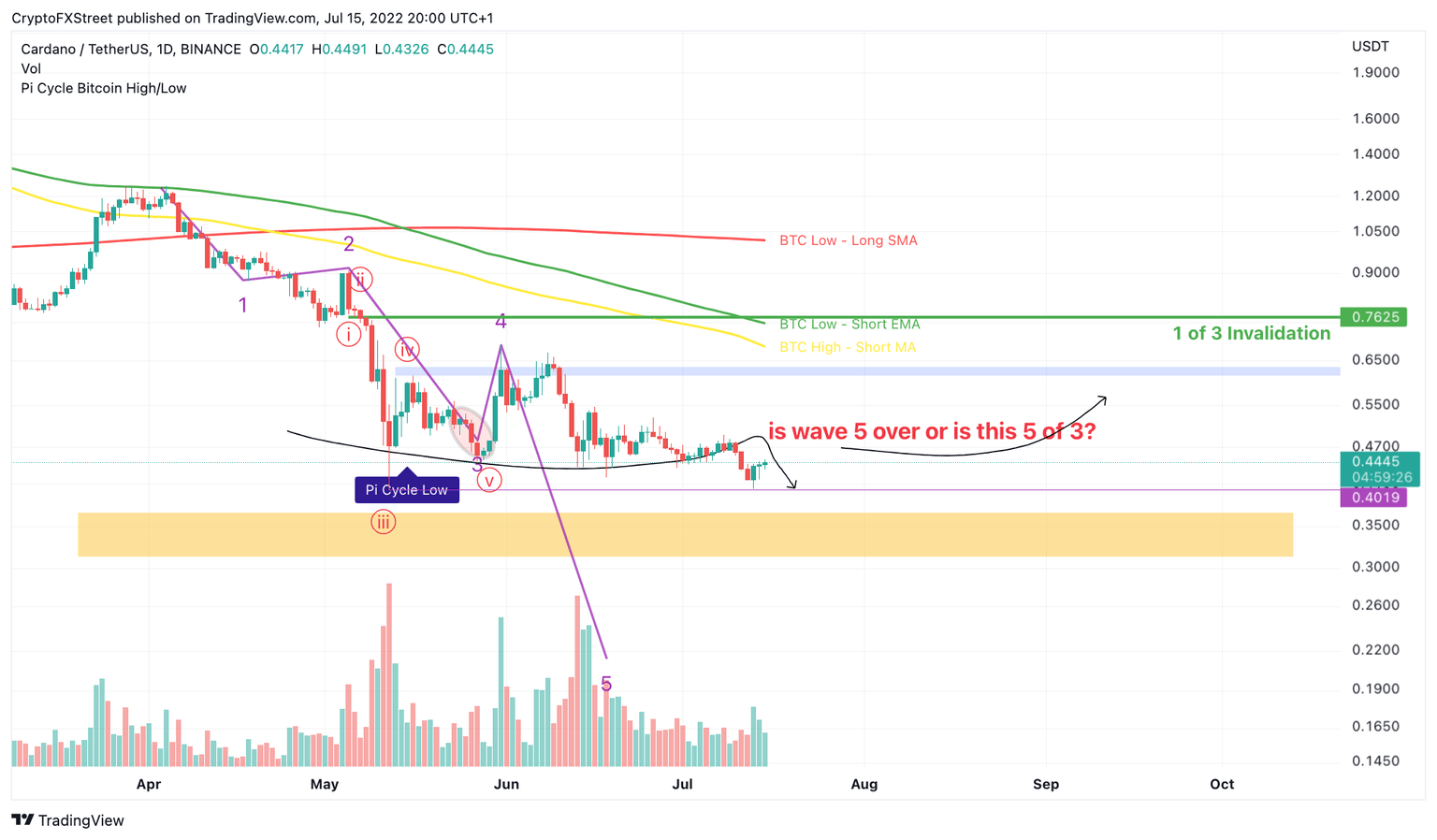 Cardano price shows reason to believe in further decline. If the sell-off occurs, there may be a knife-catching opportunity in the $0.35 region. Cardano price currently trades at $0.43 as an ongoing consolidation ensues post-rebound from the double bottom established on July 13 at $0.4019.
