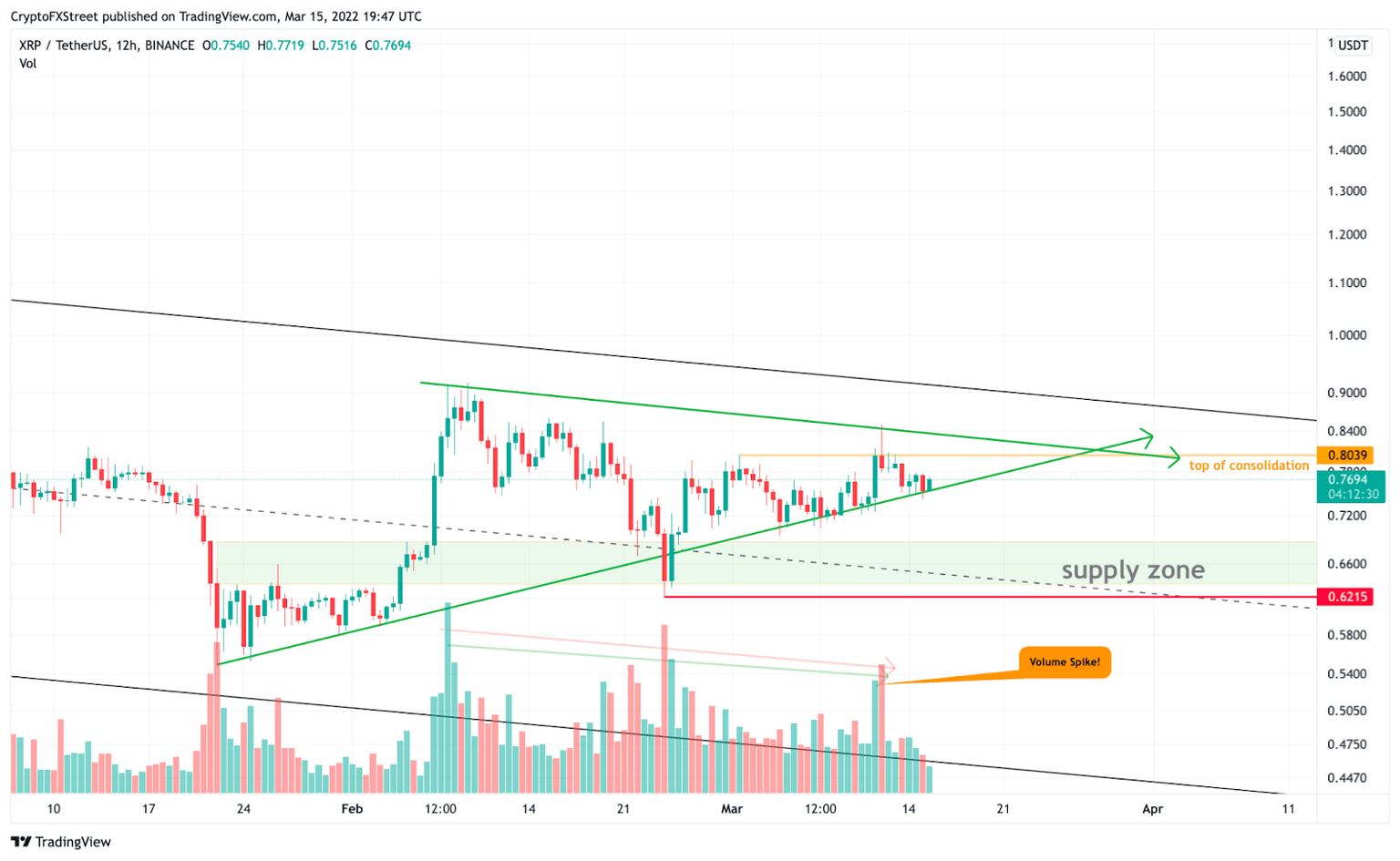 XRP price is still looking bullish despite last week's failure to stay above the weekly consolidation line. A 10% bounce from the current price of $0.77 could send Ripple price an additional 67% higher. XRP price has failed once again to close below the weekly trend line on the 12-hour chart.