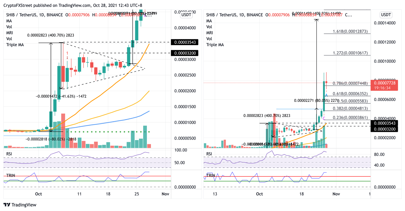 Shiba Inu price has had a spectacular rally of over 200% since slicing above the governing bullish technical pattern on October 23, reaching a new all-time high at $0.00008825. SHIB continues to target bigger aspirations, as the prevailing chart pattern suggests that the token’s bull run is not over yet.
