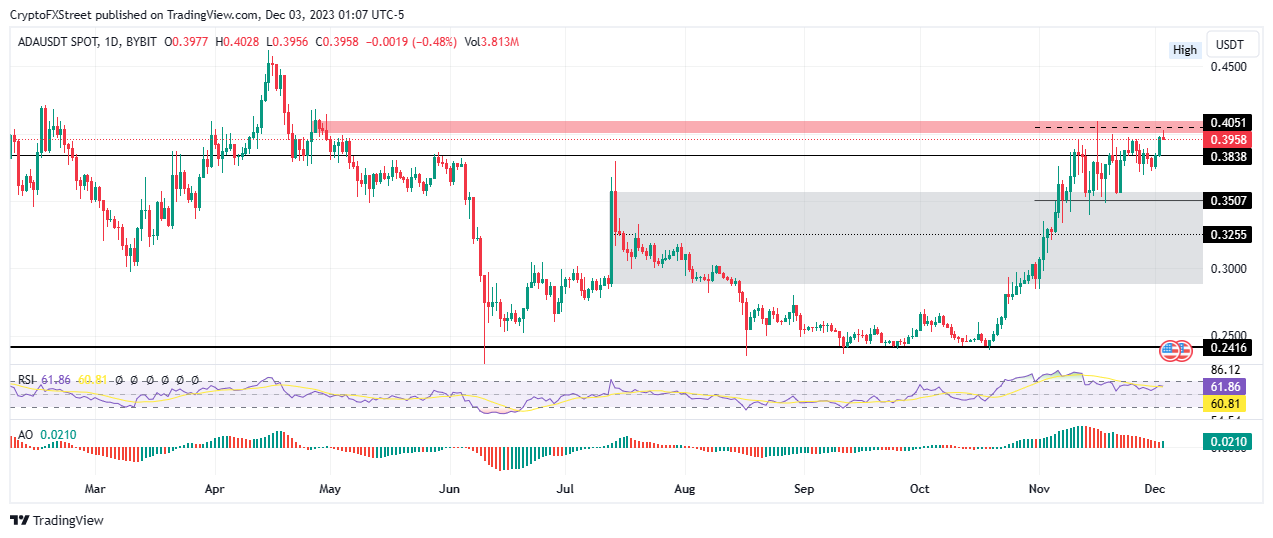Cardano (ADA) price is bullish, trying to reclaim the April highs around the $0.4500 psychological level. However, for the bulls to stay profitable, the cryptocurrency must overcome a crucial supply barrier.