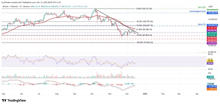 Bitcoin price was rejected from the descending trendline (drawn by connecting multiple highs since early October) last week. This trendline coincides with the 61.8% Fibonacci retracement level at $94,253 (drawn from the April low of $74,508 to the all-time high of $126,199 set in October), making it a key resistance zone. As of Monday, BTC hovers around $89,000. If BTC continues its pullback, it could extend the decline toward the next key support at $85,569, which aligns with the 78.6% Fibonacci retracement level.