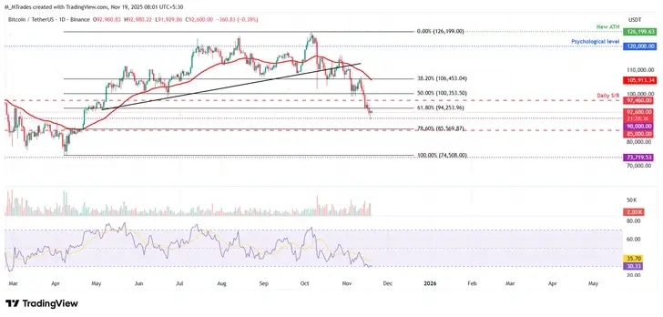 Bitcoin started the week on a negative note and extended its decline by 2%, closing below the 61.8% Fibonacci retracement level at $94,253 (drawn from the April 7 low of $74,508 to the all-time high of $126,299 set on October 6). On Tuesday, BTC dipped to $89,253 but rebounded from the key psychological $90,000 level, ultimately closing the day higher at $92,960. At the time of writing on Wednesday, BTC hovers at around $92,600.