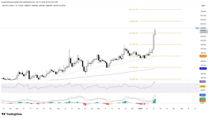 Monero approaches the $600 mark, extending the rally in price-discovery mode. At the time of writing, XMR is up 5% on Monday, building on the 18% gains from the previous day. Overall, XMR has gained nearly 35% so far this month as the Zcash developers' crisis boosts capital rotation to Monero. If Monero clears the $600 mark, it could extend the rally toward the R3 Pivot Point at $640.