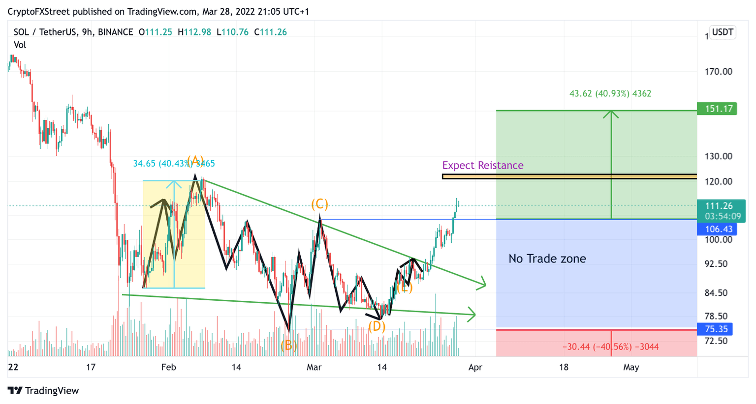 Solana price is charging forward this week as the price has breached the $100 level with ease. Solana enthusiasts could see a 40% rally soon. Solana price has ascended into the mid $110 zone to start this week's trading session. It was mentioned in last week's neutral thesis that a breach above the triangle's C wave at $106 could be the ultimate catalyst to a 40% rally.