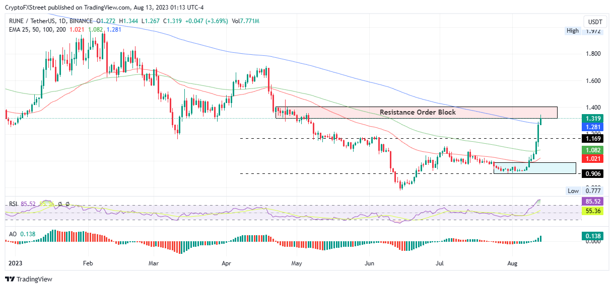 THORChain price rises 20% to beat Shiba Inu in weekend gains; Why RUNE may be due for a 25% crash