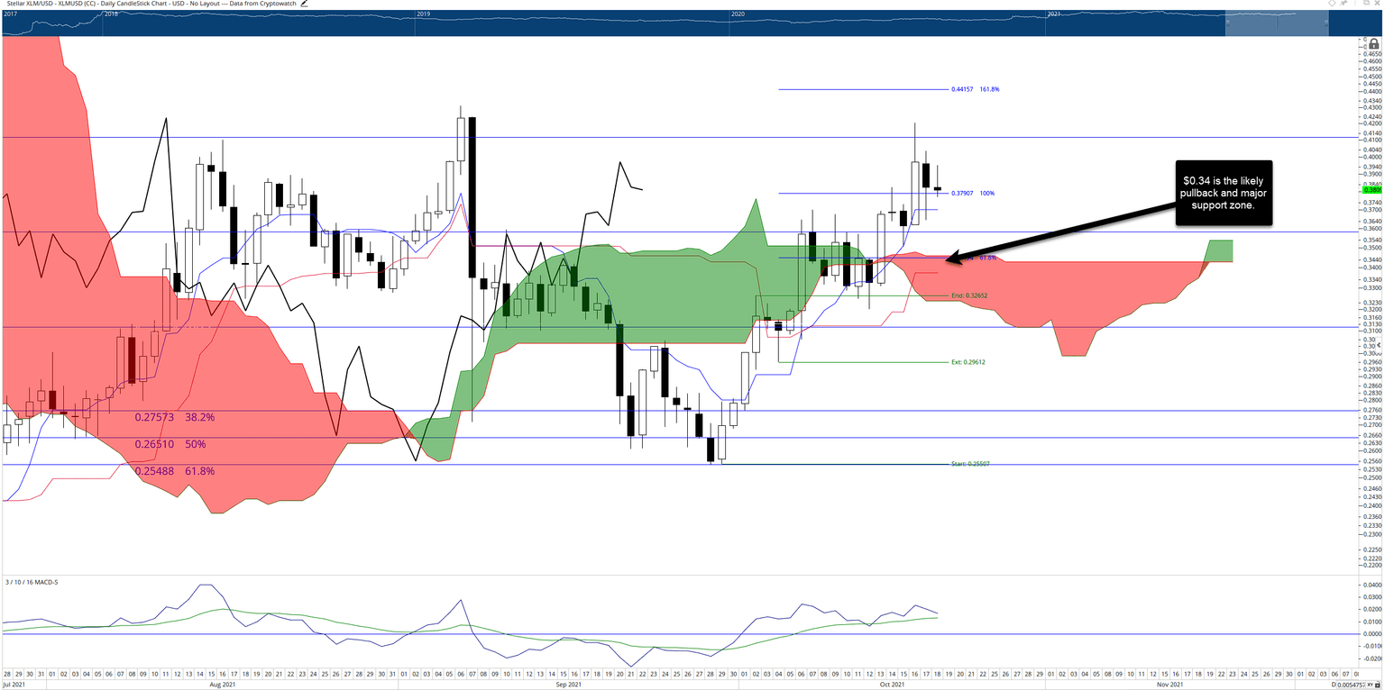 XLM price continues to pull back from the highs it made on Saturday. There are growing concerns regarding its ability to maintain its present momentum. XLM price has a very bullish set up on its $0.01/3-box Point and Figure chart. When XLM hit the $0.42 price level, that was the breach of the dominant bear trend angle on the Point and Figure chart.