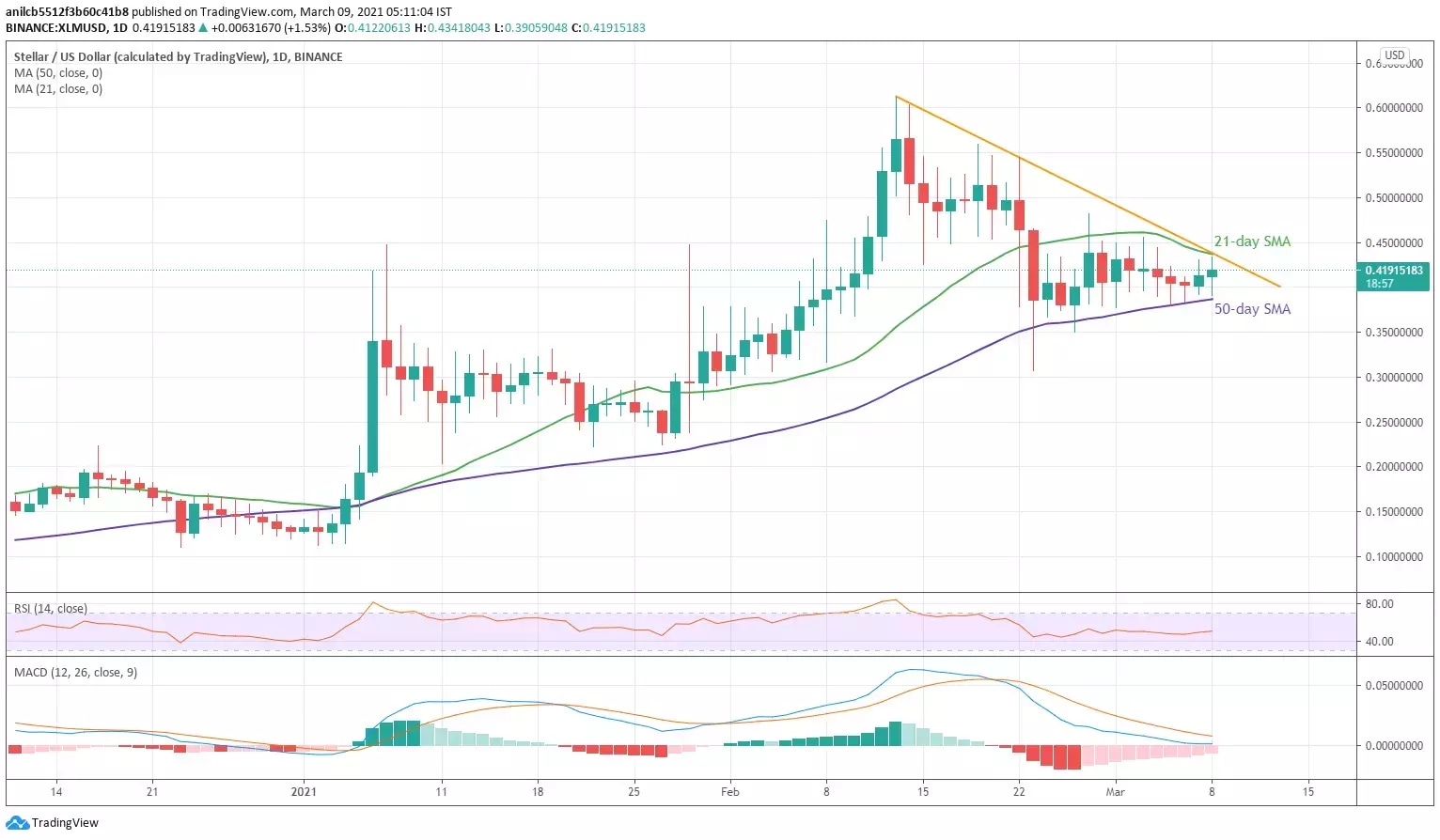 XLM/USD takes the bids around $0.4190 as crypto traders clean their screens for Tuesday’s move. Even so, the Stellar Lumens (XLM/USD) stays below the strong hurdle to the north comprising 21-day SMA and a falling trend line from February 13.