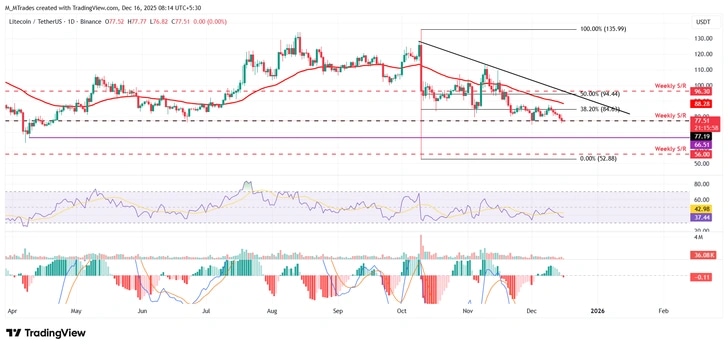 Litecoin (LTC) remains under heavy selling pressure, trading below $78 on Tuesday, extending its losing streak to seven consecutive days after being rejected at a key resistance zone. With social interest fading and momentum indicators turning increasingly bearish, downside risks remain dominant.