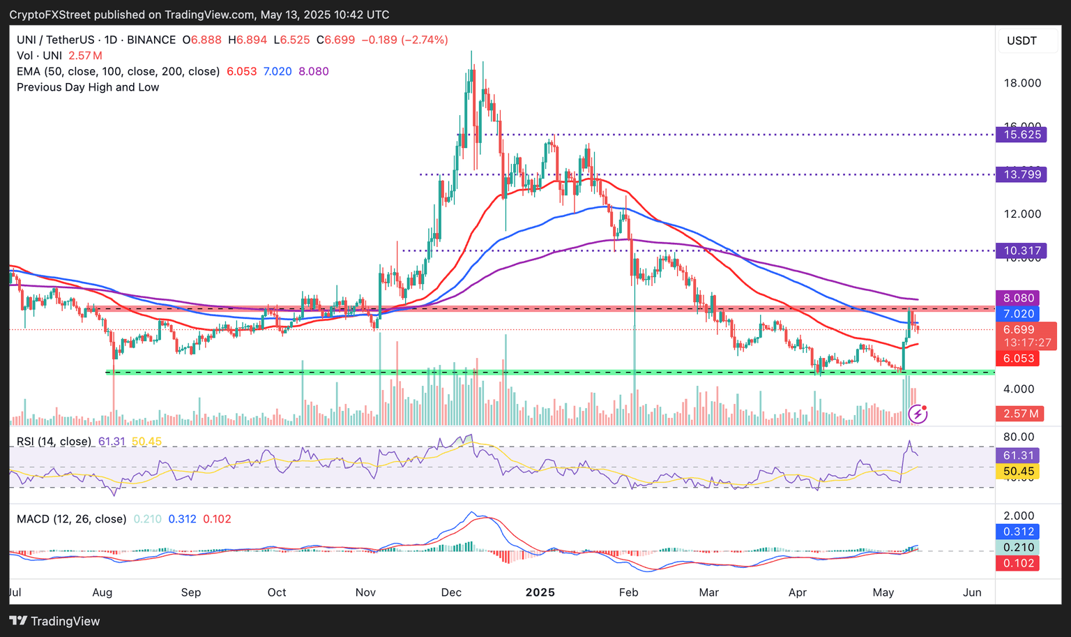 Uniswap (UNI) price hovers at $6.69 at the time of writing on Tuesday after sliding for three consecutive days. The native decentralized exchange (DEX) token encountered heavy resistance clusters around the $7.68 area over the weekend, prompting instability and a drawdown potentially exacerbated by profit-taking.