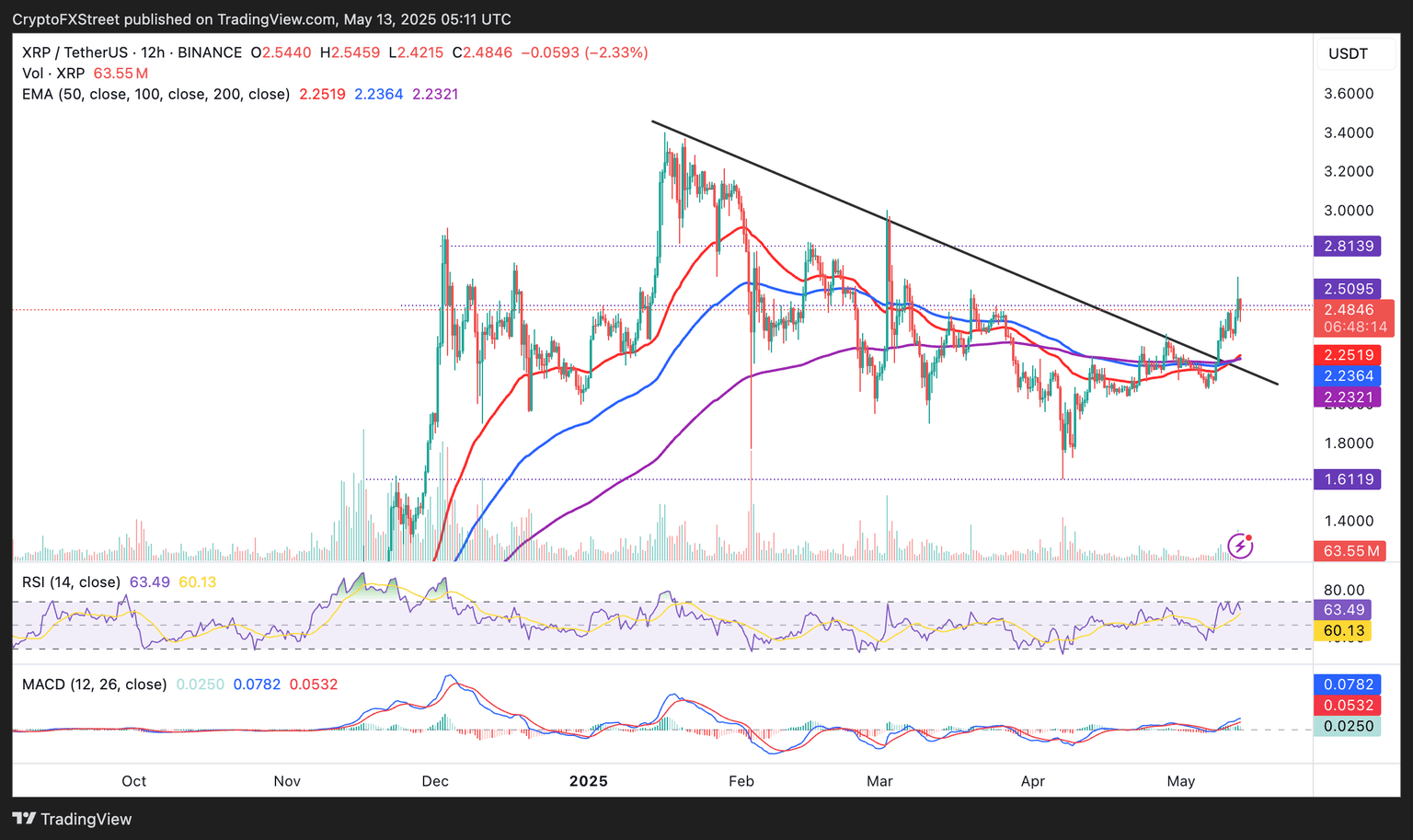Ripple (XRP) price trims gains to exchange hands at $2.44 at the time of writing on Tuesday, as the crypto market puts the brakes on the rally triggered by the trade deal between the United States and China, on top of last week's limited bilateral trade agreement with the United Kingdom (UK). The sudden pullback from Monday's highs triggered massive liquidations totaling $35 million in the last 24 hours, according to CoinGlass data. Longs accounted for the lion's share of the liquidations at $22.82 million, hinting at declining trader interest in XRP's short-term price action.