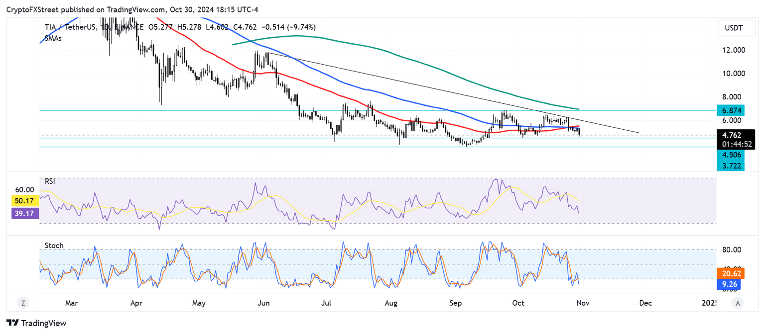 Celestia (TIA) is down about 9% following increased negative sentiment surrounding its cliff unlock, which is worth about 176 million TIA tokens. The token could see a correction if it fails to bounce off the $4.506 level.