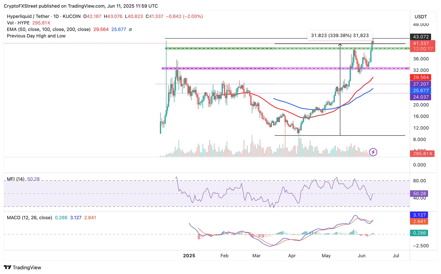 Hyperliquid (HYPE) has, at least since the April 7 tariff-triggered crash that saw it drop to $9.37, surged nearly 400% to trade near $41.33 at the time of writing on Wednesday. The high-performance Layer-1 protocol, optimized for user-built applications, has retraced slightly from the all-time high achieved near $43.00, suggesting potential profit-taking. The lethargic sentiment currently in the market follows the recently concluded trade talks between top officials from the United States (US) and China.