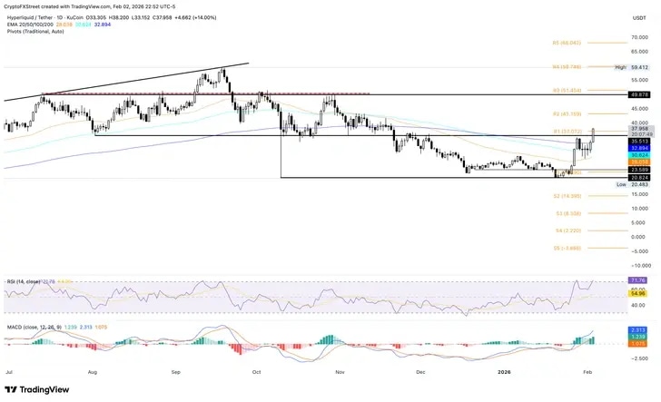 Hyperliquid (HYPE) extended its recovery by 8% at press time on Tuesday, driven by the HIP-4 proposal to add outcome trading, referring to prediction markets and bounded options contracts. Heightened retail interest in the decentralized exchange and its token is evident from a more than 25% increase in HYPE futures Open Interest, indicating elevated capital inflows. The technical outlook for HYPE is bullish, with buying pressure and trend momentum rising.
