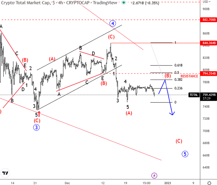 Markets are slow across the bord, so cryptos are alos not moving much, therefore we do not see any major changes in recent trends. As a reminder of an overlall direction, I am posting the Crypto Total Market Cap where we see ongoing weakness after three waves up from November lows, followed by a five-wave drop. As such, weakness will be expected to resume lower but current wave B can still test higher resistance, near 800B, if maybe market moves will be more choppy and slow through the holidays.