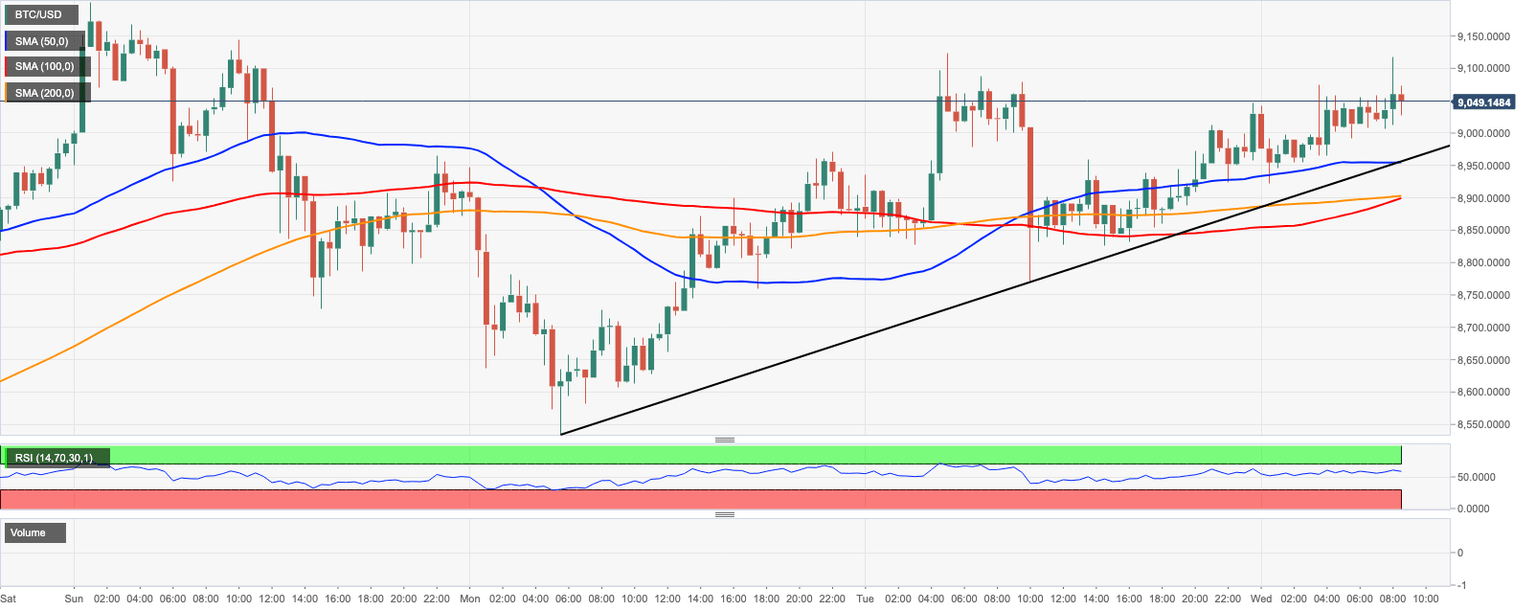 BTC/USD is changing hands at $9030, mostly unchanged both on a day-to-day basis and since the beginning of Wednesday. The coin recovered from the intraday low of $8,922. Now it is trading within the strong short-term bullish bias amid high volatility.