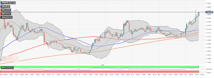 Ripple came close to the highest level of $0.2255 and retreated to $0.2200 by press time. The third-largest digital asset has been growing steadily after the resistance of $0.2100 gave way. XRRP/USD has gained 4.5% since the beginning of Monday, moving in sync with the market. The short-term trend is bullish.