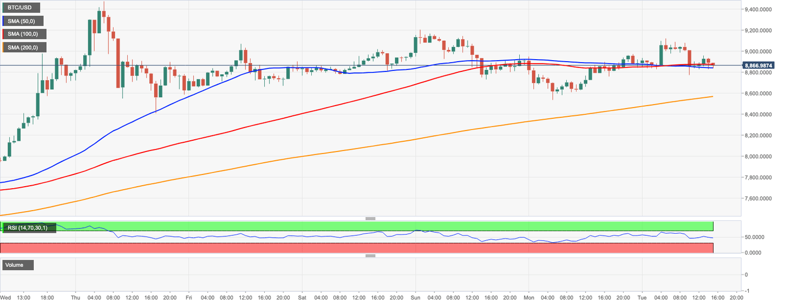 The Bitcoin price rejected from the intraday high of $9,122 and settled below $9,000 again ahead of the US session opening. The coin is back inside the recent range as the breakthrough from a falling triangle pattern on the 1-hour chart proved to be false. At press time, Bitcoin is hovering at $8,800 within the short-term bearish bias and a focus on support at $8,500.
