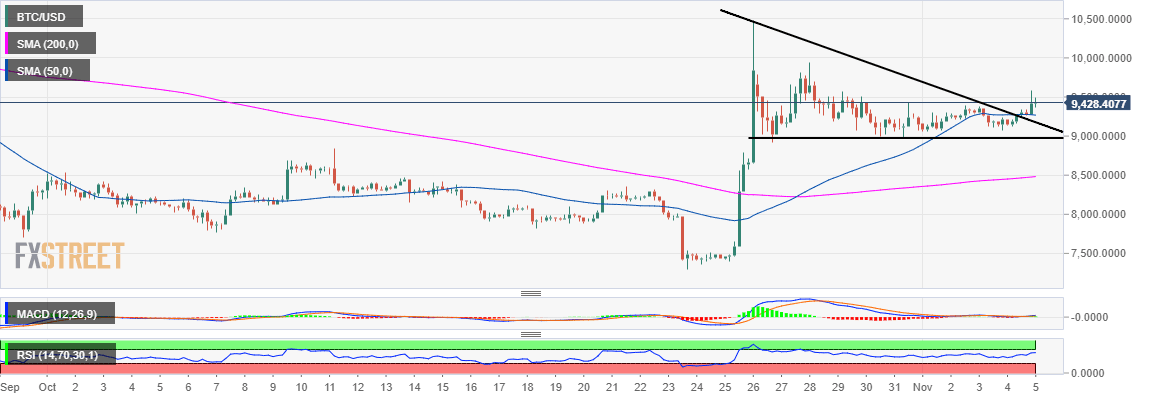 Bitcoin finally broke above the descending triangle in a bid to push towards $10,000. The price hit levels past $9,500 but stalled at $9,589 (weekly high). BTC has since adjusted to $9,428 (current market value). The 50 Simple Moving Average (SMA) on the four-hour chart currently at $9,269 is establishing as he next support area. $9,000 is also a key area to keep in mind in addition to the 100 SMA.
