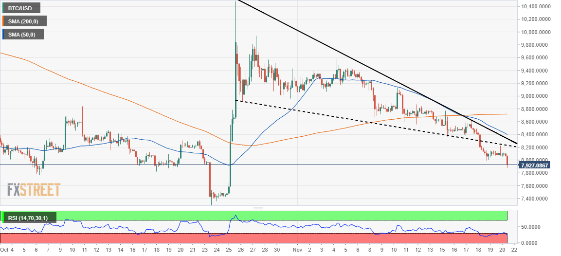 - Bitcoin refreshes the lows under $8,000 after breaking from the falling wedge pattern.