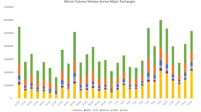 “The renewed altcoin interest has caused a surge in trading volume on perpetual contracts across major exchanges. Since July 1st, total Altcoin perpetual futures volume across major exchanges has grown from $2 billion to $5.1 billion, a 150% increase.”