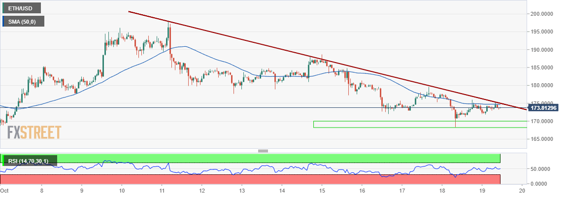 Ethereum also made a swing towards $180 but failed. This left a gap to be explored by the bears. In turn, ETH retested the support $173. The trading activities have, however, been low since the drop, hence Ethereum is lethargic in the its recovery. For now, Ethereum is trading at $173.85 while the immediate upside is limited by the 50 Simple Moving Average (SMA) on the one-hour chart.
