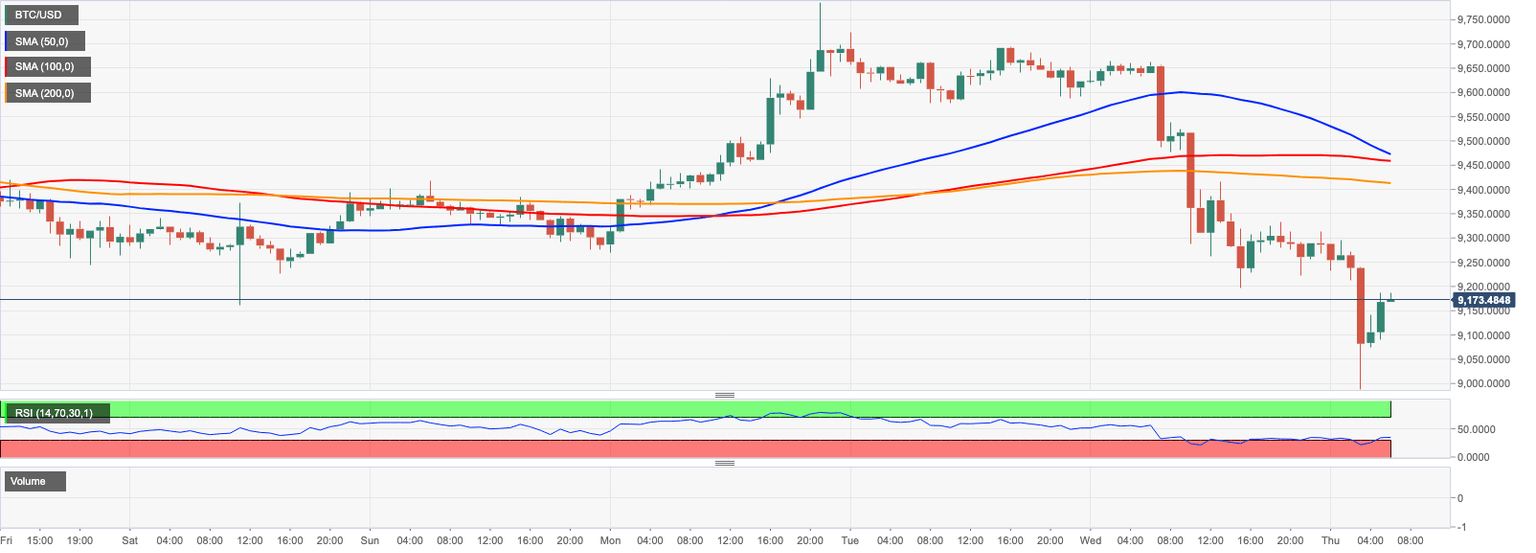 BTC/USD dived under $9,000 during early Asian hours and recovered to $9,180 by press time. The first digital asset has lost over 1% since the start of Thursday and over 5% in the recent 24 hours. The coin settled above $9,000 amid the short-term bullish trend and high volatility.