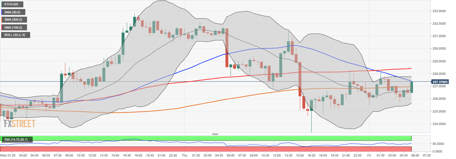 At the time of writing, ETH/USD is changing hands at $226.70. The price touched $225.47 during early Asian hours, but managed to regain ground. ETH/USD has stayed mostly unchanged since the beginning of Friday and lost over 1.7% in the recent 24 hours. The coin is moving within a short-term bearish trend amid low volatility.