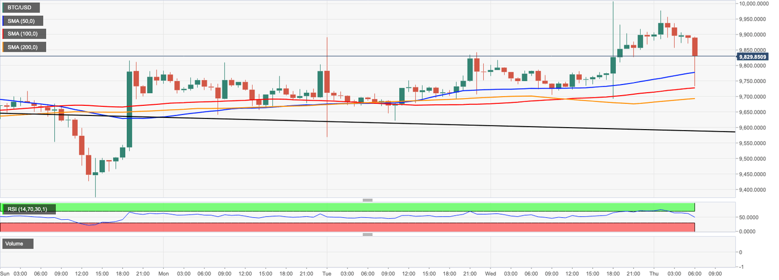 BTC/USD touched the intraday high at $9,977 and stopped within a whisker of critical $10,000 during early Asian hours. At the time of writing, the first digital coin is changing hands at $9,850, having gained about 1.5% on a day-to-day basis. Now it is trading within the short-term bearish bias amid expanding volatility.