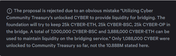 CyberConnect released an emergency proposal, suggesting the use of CYBER tokens that remain locked in the network’s treasury to provide liquidity for cross-chain bridges. The proposal was rejected, with the crypto community calling out the network for possible pump-and-dump.