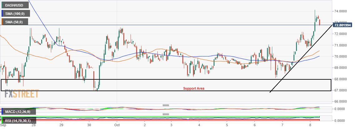 - Dash extended the price action above $74 amid broad-based cryptocurrency recovery.