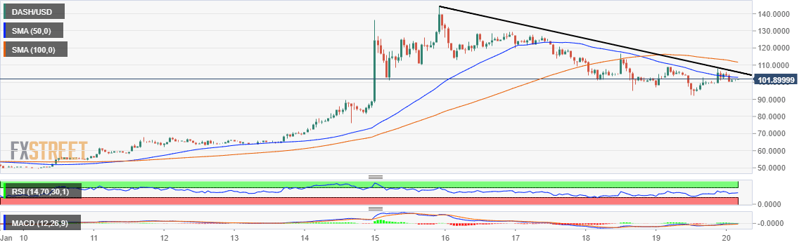 Dash was among the biggest gainers in the January 2020 bull-run. From the December low around $38, the price spiked remarkably, breaking numerous barriers. The new 2020 high at $144 marked the end of the impressive bullish action. Dash bears have since been pushing a reversal below the descending trendline as observed on the 1-hour chart.