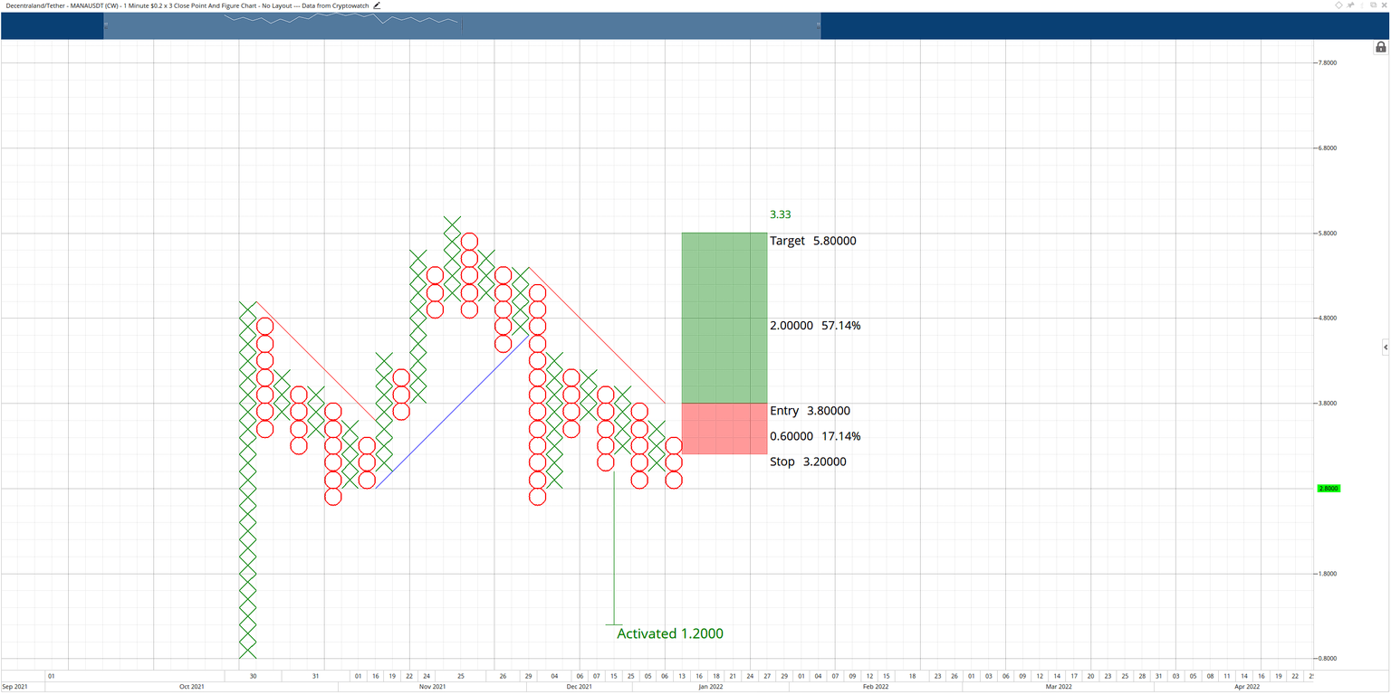 Decentralnd price action, while bearish, is not without its reasons for a bullish outlook. A hypothetical long setup with a buy stop order at $3.80, a stop loss at $3.20, and a profit target at $5.80. The trade is based on the simultaneous breakout above the upper trendline of a descending triangle and the bear market trendline. If MANA hits the entry, it converts the $0.02/3-box reversal Point and Figure chart into a bull market.