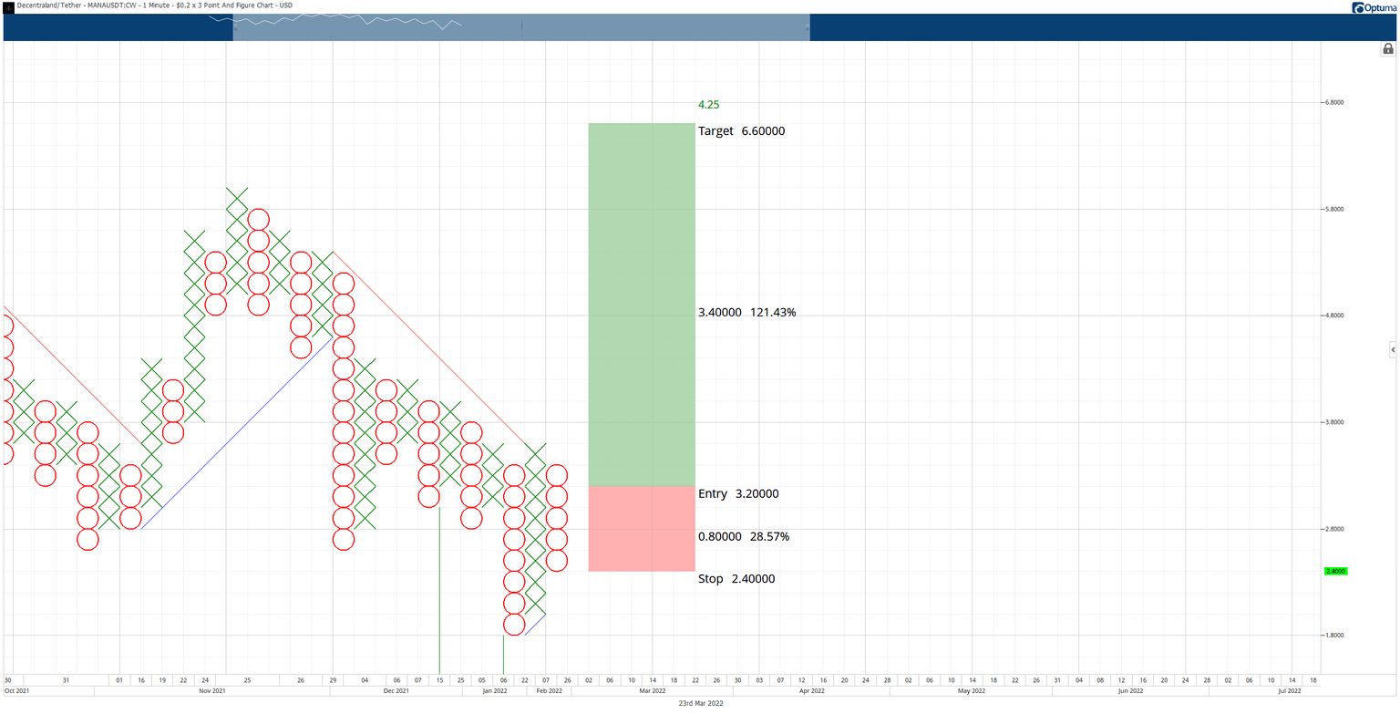 Decentraland price converted into a bull market on its Point and Figure chart on February 7, 2022, when MANA moved to $3.60. Sellers came in and created a new reversal column of Os. The pullback is viewed as a signal of strength, not weakness, with entry opportunities forming from that O column.