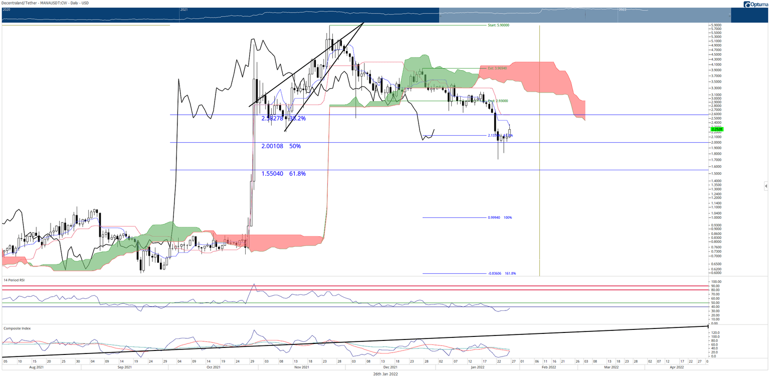 The first hurdle that Decentraland price must defeat is a confluence zone of resistance between the Tenkan-Sen at $2.50 and the shared $2.58 price level with the 38.2% Fibonacci retracement and Kijun-Sen. The likelihood of MANA pushing through the $2.58 zone decreases significantly if the Composite Index oscillator creates a high above the January 16 high (in the oscillator) – hidden bearish divergence. But if MANA can create a close above the January 16 close, then the hidden bearish divergence will be avoided.