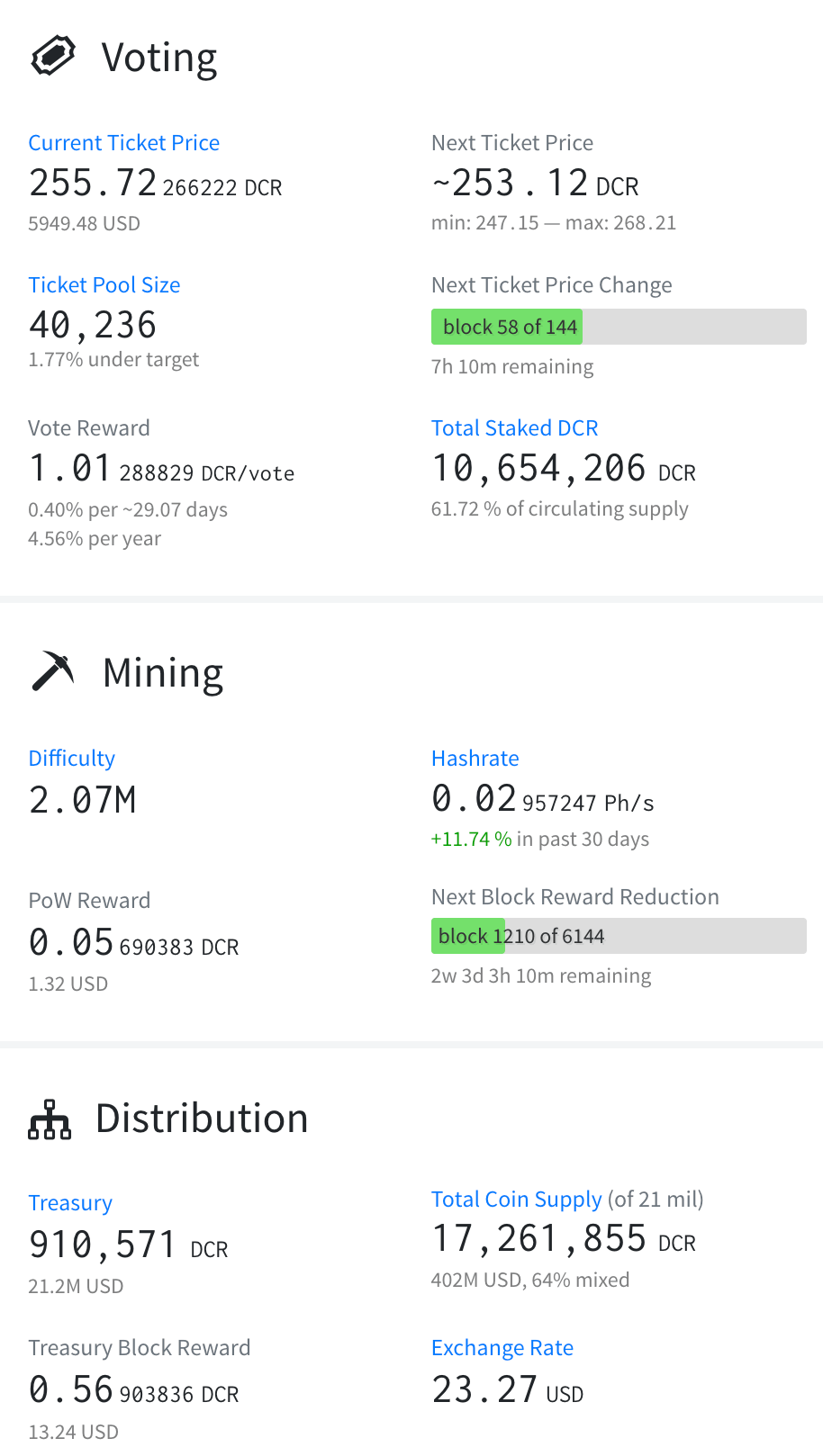 - DCR mining hashrate has increased over 10% in the last 30 days, while more than 60% of the circulation supply is staked.