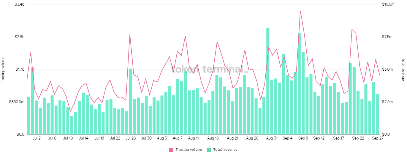 Uniswap trading volume vs. total revenue. Source: Token Terminal