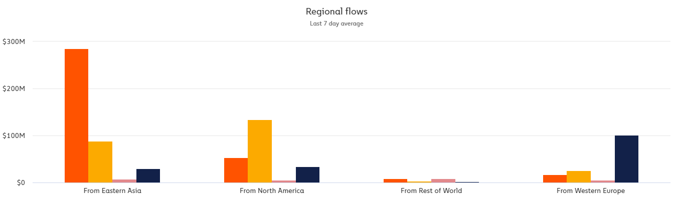 According to data from Chainalysis, there has been a significant amount of regional Bitcoin (BTC) flows happening within eastern Asia, as highlighted by the tall orange bar in the graph below. This suggests that crypto holders in the region have been shifting around their holdings in response to the regulatory crackdown.