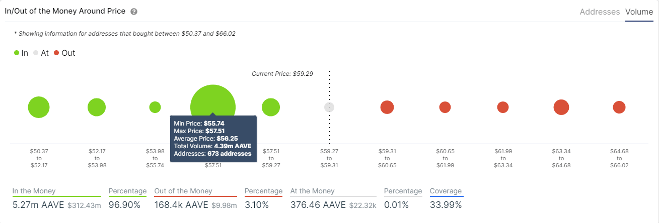 Earlier in the week, AAVE touched its highest level since its introduction into the market at $70.44 before staging a technical correction. As of writing, Aave is trading around $59, gaining nearly 40% in the past seven days. IntoTheBlock's IOMAP shows more than 600 addresses bought 4.39 million Aave between $55.70 and $57.50, suggesting that the price is likely to face strong support in that area. On the other hand, 427 new addresses that bought AAVE between $63.30 and $64.70 could look to break even when the price reaches that level and keep the upside potential limited.