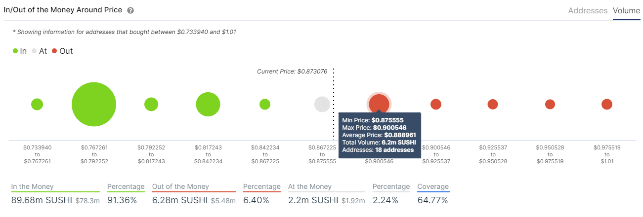 SUSHI gained nearly 40% on Friday and came in within a touching distance of the key psychological level of $1. Following this impressive rally, a technical correction followed on Saturday but SushiSwap is still up nearly %30 for the week at $0.8700. According to IntoTheBlock's IOMAP, 18 new addresses accumulated a total of 6.2 million SUSHI between $0.8755 and $0.9000, making this area a critical hurdle before price could target $1. On the flipside, 12.85 million SUSHI were bought by 289 new addresses between $0.8172 and $0.8422, marking this area as the likely completion point for a correction.