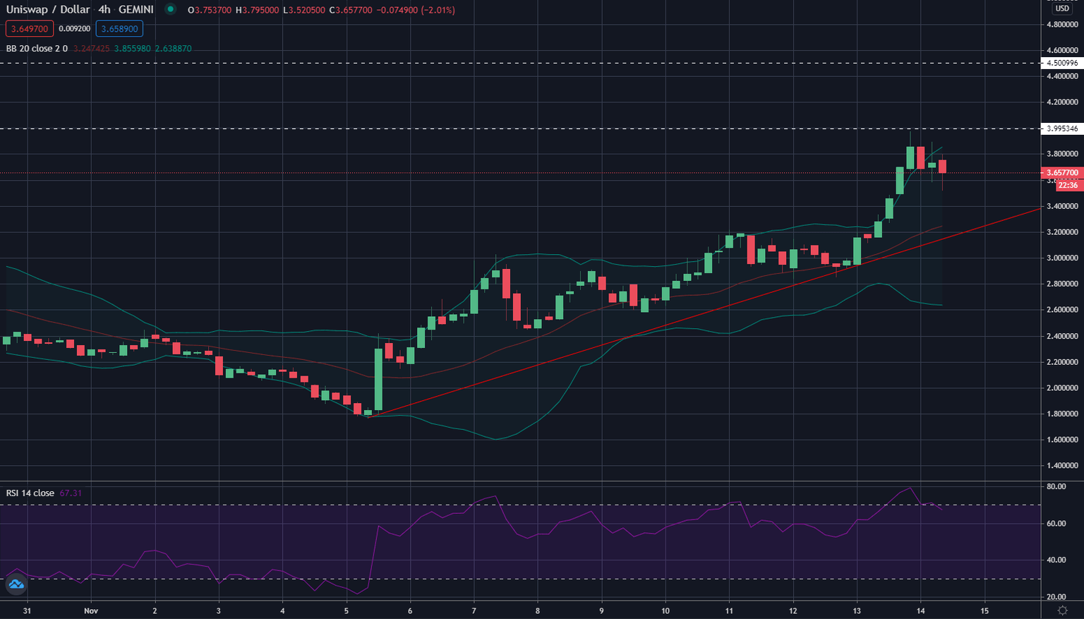 UniSwap rose to its highest level in five weeks at $3.9750 on Friday but struggled to preserve its bullish momentum. At the moment, UNI is losing 5% on the day at $3.6577 but is up 26% since the start of the week. The Relative Strength Index (RSI) indicator on the 4-hour chart touched its highest level at 80 on Friday and UNI seems to have gone into a consolidation phase. On the downside, the correction could continue to $3.2, where the ascending trend line coming from November 5th and the mid-point of the Bollinger Band merge. If this area holds as support, the price needs to make a daily close above $4 in order to continue to push higher.