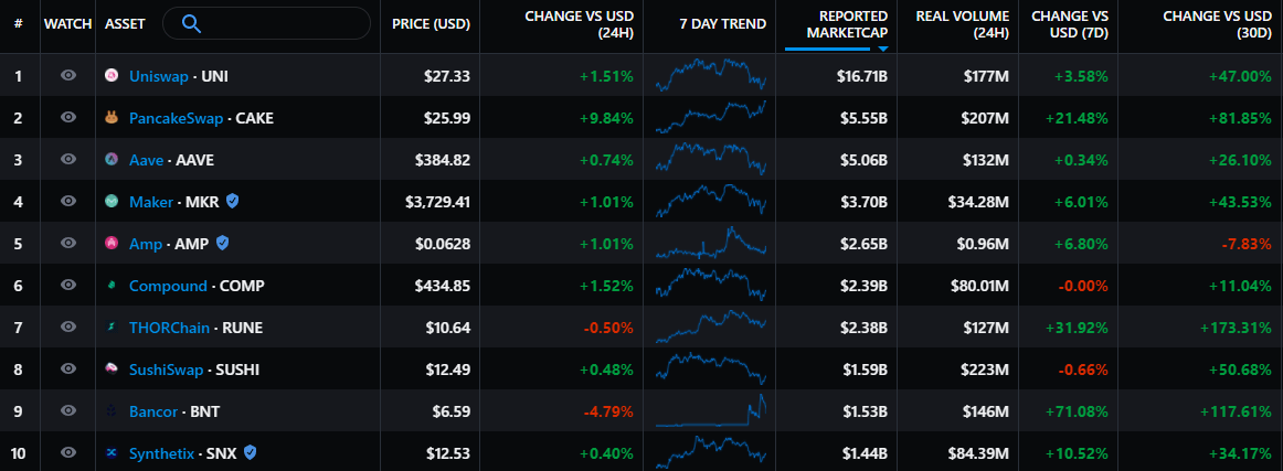This suggests that popular DeFi-related tokens with multi-faceted utility within the crypto and DeFi ecosystem have attracted investors' attention. Typically, Uniswap (UNI) and SushiSwap (SUSHI) lead among DeFi tokens but a few other strong gainers this week include a 22% increase for Convex Finance and a 17.84% increase from PancakeSwap.